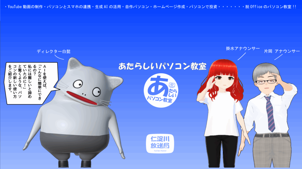「あたらしいパソコン教室」 こちらはYouTubeチャンネル「あたらしいパソコン教室」のオフィシャルサイトです。 YouTube動画 クリックするとYouTubeのチャンネルから、YouTube動画が再生されます。 #02 かんたんAI動画づくり ワンクリックで動画生成 無料で166クレジット あなたの写真1枚で動画を作成 [動画生成AI入門] #無料お試し #かんたん 2025年11月13日 コメントはまだありません Read More » #01 かんたんAI動画づくり Halloween 特別編 あなたの写真1枚で動画を作成 最先端のコスプレは化粧も衣装もいらない!!! #halloween #無料お試し 2025年10月31日 コメントはまだありません Read More » #00 詐欺サイト警報 突然この画面が現れました。マイクロソフトさんこの電話番号犯罪系となっています。 2025年4月16日 コメントはまだありません Read More » 音楽配信 Apple Music / Spotify / Amazon Music等で音楽配信サービスで配信中。iTunes / Amazon Music / レコチョク等音楽ダウンロードサービスでダウンロード販売中。 彼女には無邪気さと儚さが混在している。[須野愛]がSpotifyで公開されました。 2025年6月17日 コメントはまだありません Read More » TVショッピングマジックテーマ激安ロック[Niyodogawa Digital Orchestra]がSpotifyで公開されました。 2025年5月16日 コメントはまだありません Read More » 夜の彼方へ[須野愛]がSpotifyで公開されました。 2025年5月4日 コメントはまだありません Read More » 小春日和がSpotifyで公開されました。 2025年4月20日 コメントはまだありません Read More » AIキャラクター『須野 愛』の画像を期間限定(2026年2月末まで)で無料配布中! ここをクリック 画像AIプロンプトコピペ (テスト中) 動画AIプロンプトコピペ(テスト中)